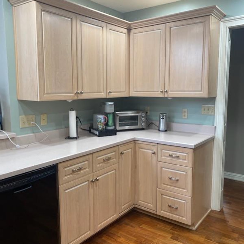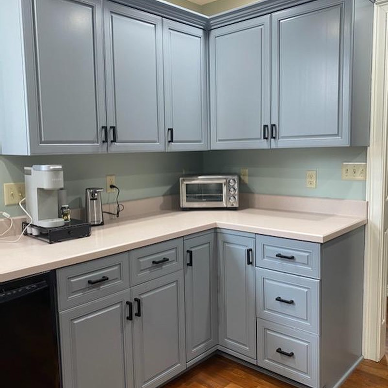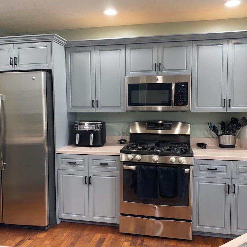 Ready to update from the pickled finish on kitchen cabinets? Looking for a quick update with paint? Check out this recent cabinet!From pickled finish to A beautiful gray with a hint of blue the home owner picked. Just beautiful. Soft and very young and relaxing color.#cwd#paintedcabinets
