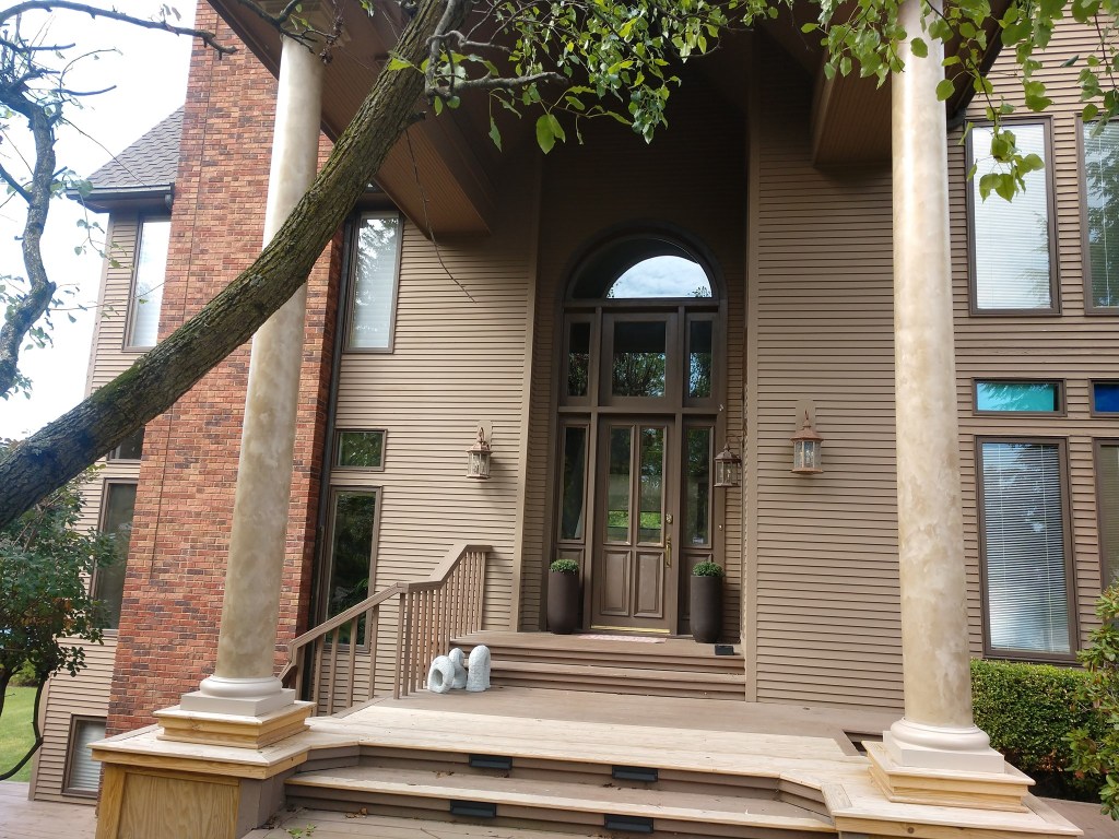 Whether it’s cabinets, an accent wall, whole room-ceiling area, doors, adding color and texture, or as simple as making a ceiling medallion match to anchor the fixture. We marbleize columns interior and exterior. We have marbleized in churches and in our own Allen County Courthouse!